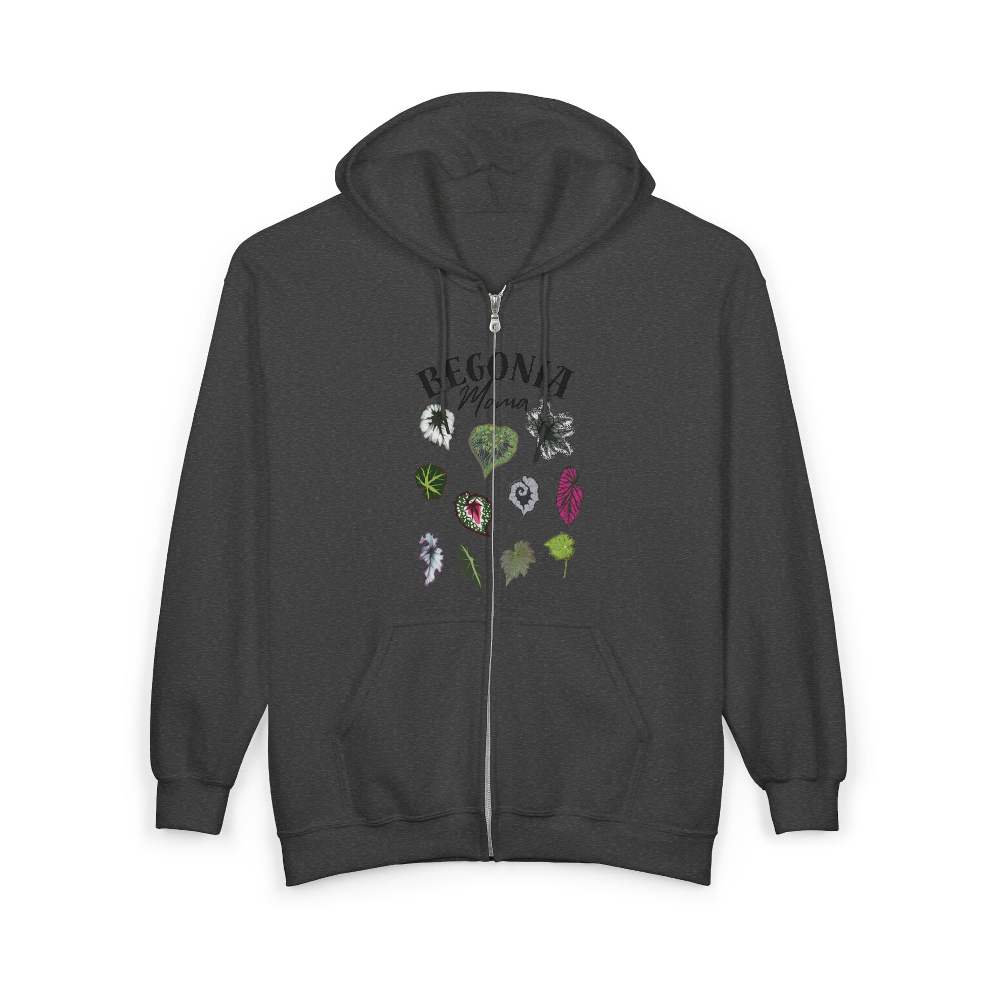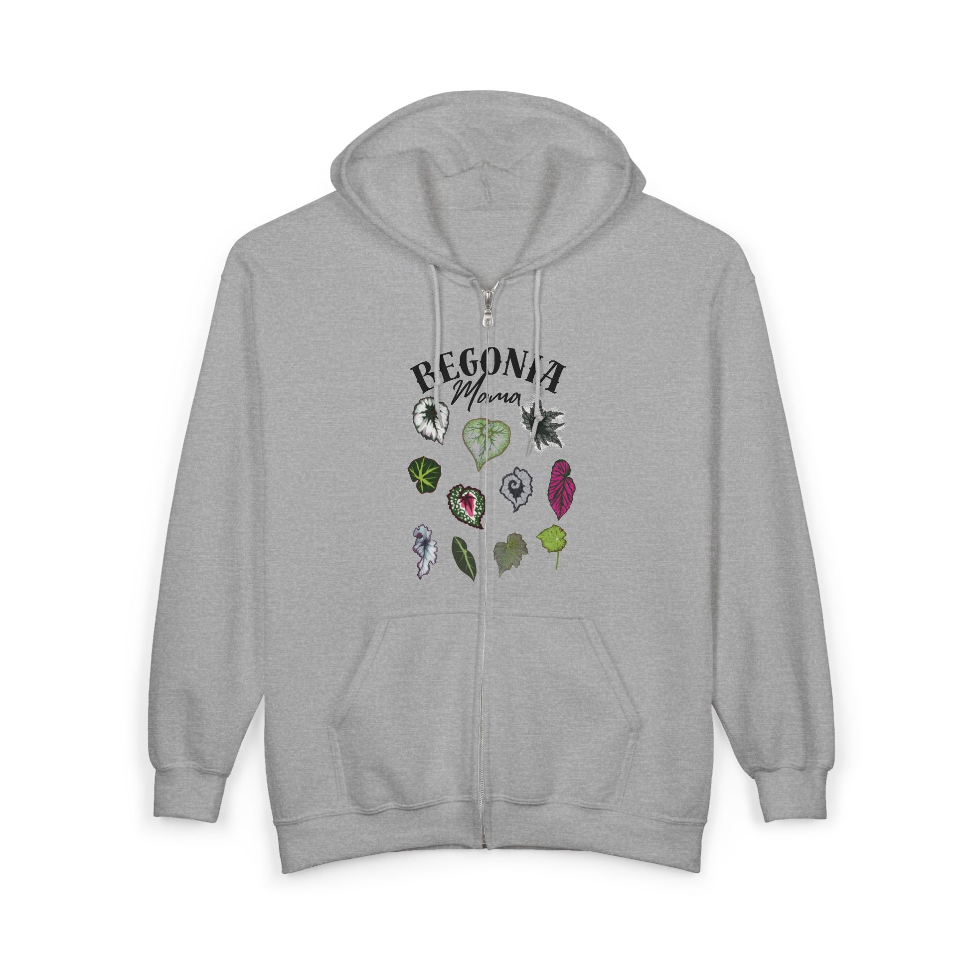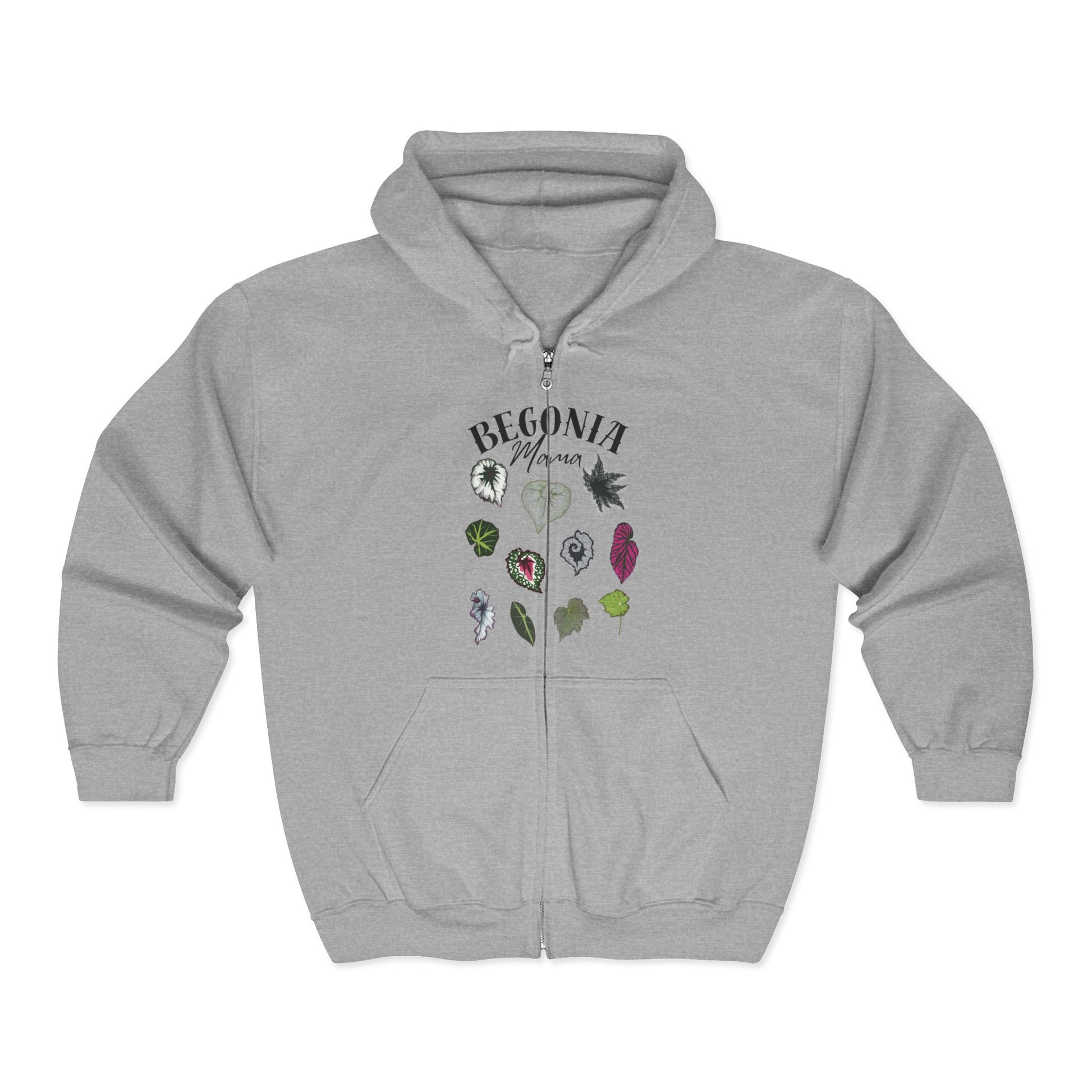 Soft, worn-in warmth with a gentle botanical heart. This full-zip hoodie brings a quiet, plant-lover’s vibe to everyday wear: Printed leaves and tiny begonia sketches circle the chest like a small collection of pressed specimens. It feels like an afternoon spent potting and swapping cuttings — the roomy pockets hold pruning shears and a phone, the adjustable hood tucks up against a chilly porch, and the medium-weight fabric drapes comfortably over layered tees. Neutral heather gray keeps the artwork calm and easy to pair, while durable details (metal zipper, reinforced cuffs, and tubular knit construction) make this a hoodie that ages gracefully alongside your plant shelf.