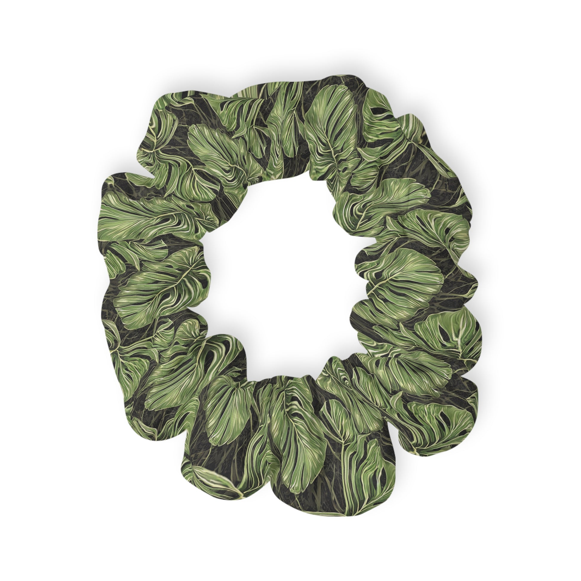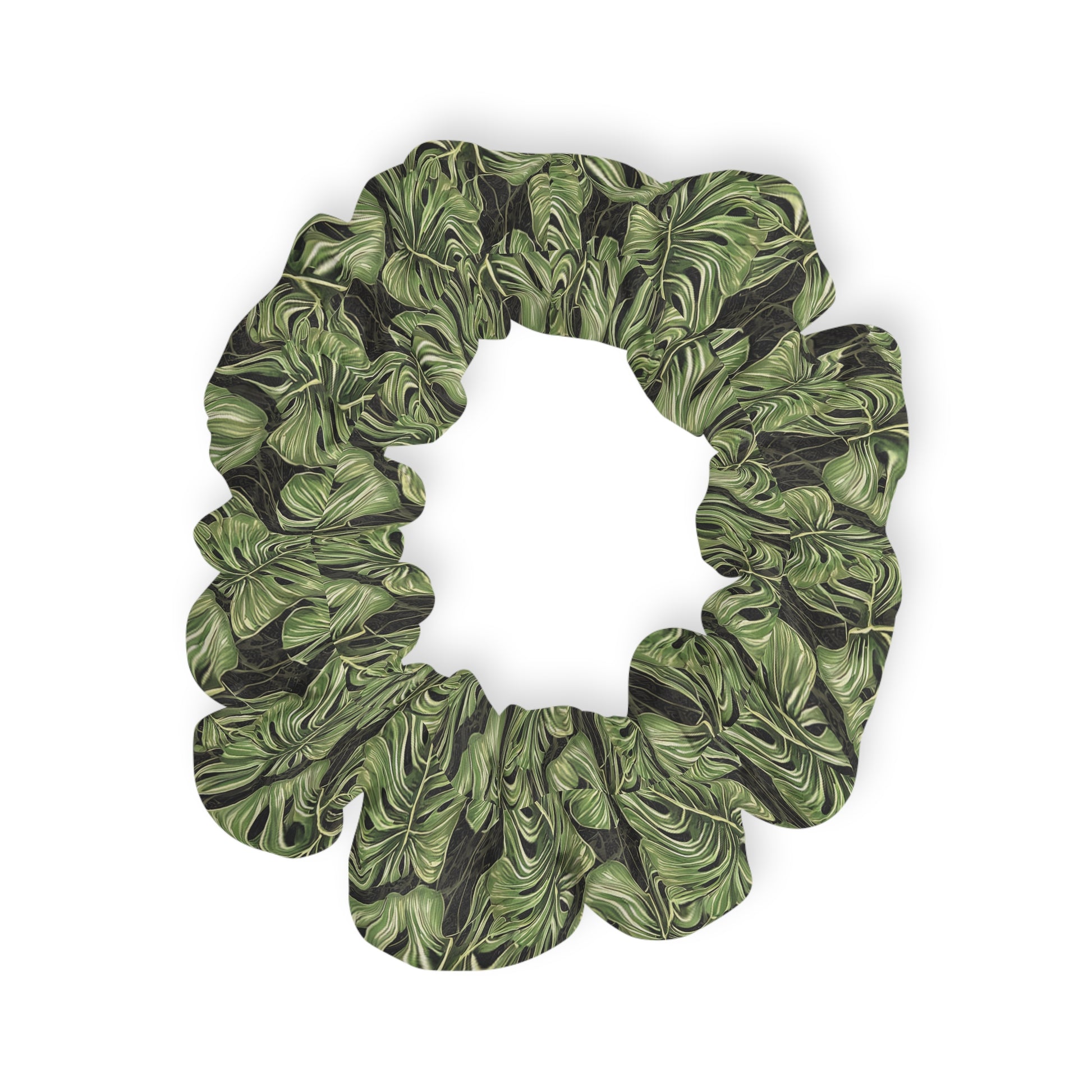 Soft, leafy scrunchie that brings a relaxed, botanical vibe to everyday hair. The lightweight polyester jersey has a silky hand and lively, all-over print of layered green foliage that looks like you wandered into a sunlit conservatory. It gathers lightly around the elastic to add gentle volume to ponytails, buns, and half-up styles without tugging or creasing. Slip it on at the sink, tuck it into your bag, or wear it stacked with other scrunchies to echo a nature-filled outfit or a houseplant-curating afternoon. The resilient fabric keeps its shape and color through repeated wear and quick washes, so the print stays fresh as new-season leaves.