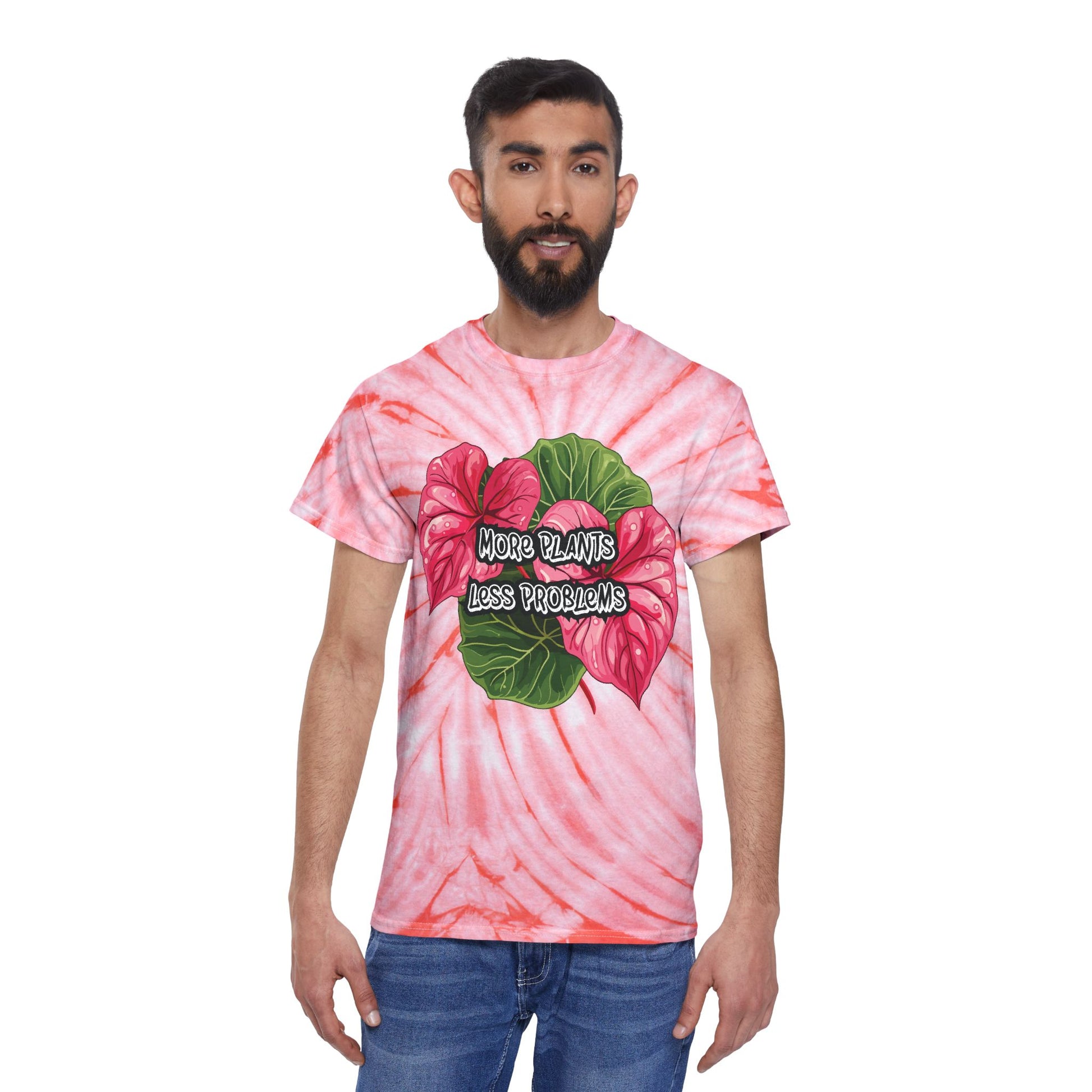 Sun-warmed and playfully botanical, this tie-dye tee brings the calm of a houseplant corner into everyday wear. A soft yellow spiral echoes sunlight through leaves, while hand-drawn anthurium artwork centers the chest with the phrase “More Plants Less Problems.” It’s the kind of shirt you pull on when you want to feel grounded, cheerful, and a little cheeky — whether you’re tending a new cutting, wandering a weekend market, or hosting a slow Sunday coffee swap. The classic fit and sturdy construction keep it feeling familiar and lived-in, while the unique dye pattern means every piece has subtle variations that make it feel personal. Wear it with jeans and a tote for plant shop runs, or layer under an open cardigan during planting sessions.